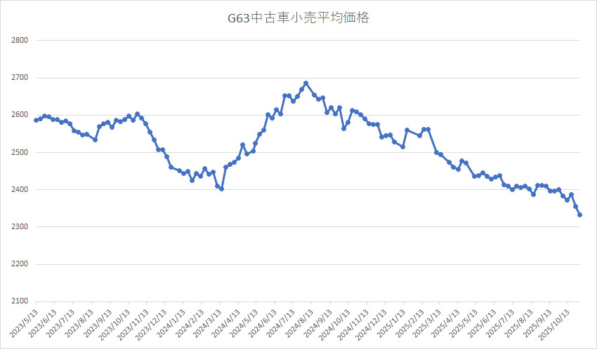 2023年に入り中ごろから価格相場が下がり始め、Gクラスも市場に台数が増え下がり傾向にあります。